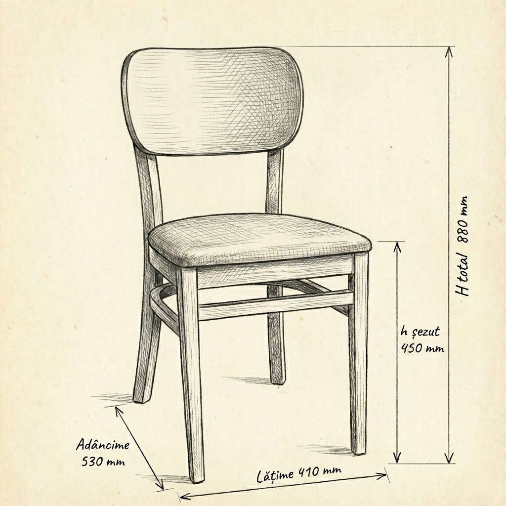 Ideal pentru spații HoReCa sau rezidențiale. Realizat din fag, cunoscut pentru durabilitate, cu șezut tapițat pentru confort sporit. Finisajul este aplicat cu lac, păstrând aspectul natural al lemnului. Dimensiuni: 410 × 530 × 450 / 880 mm