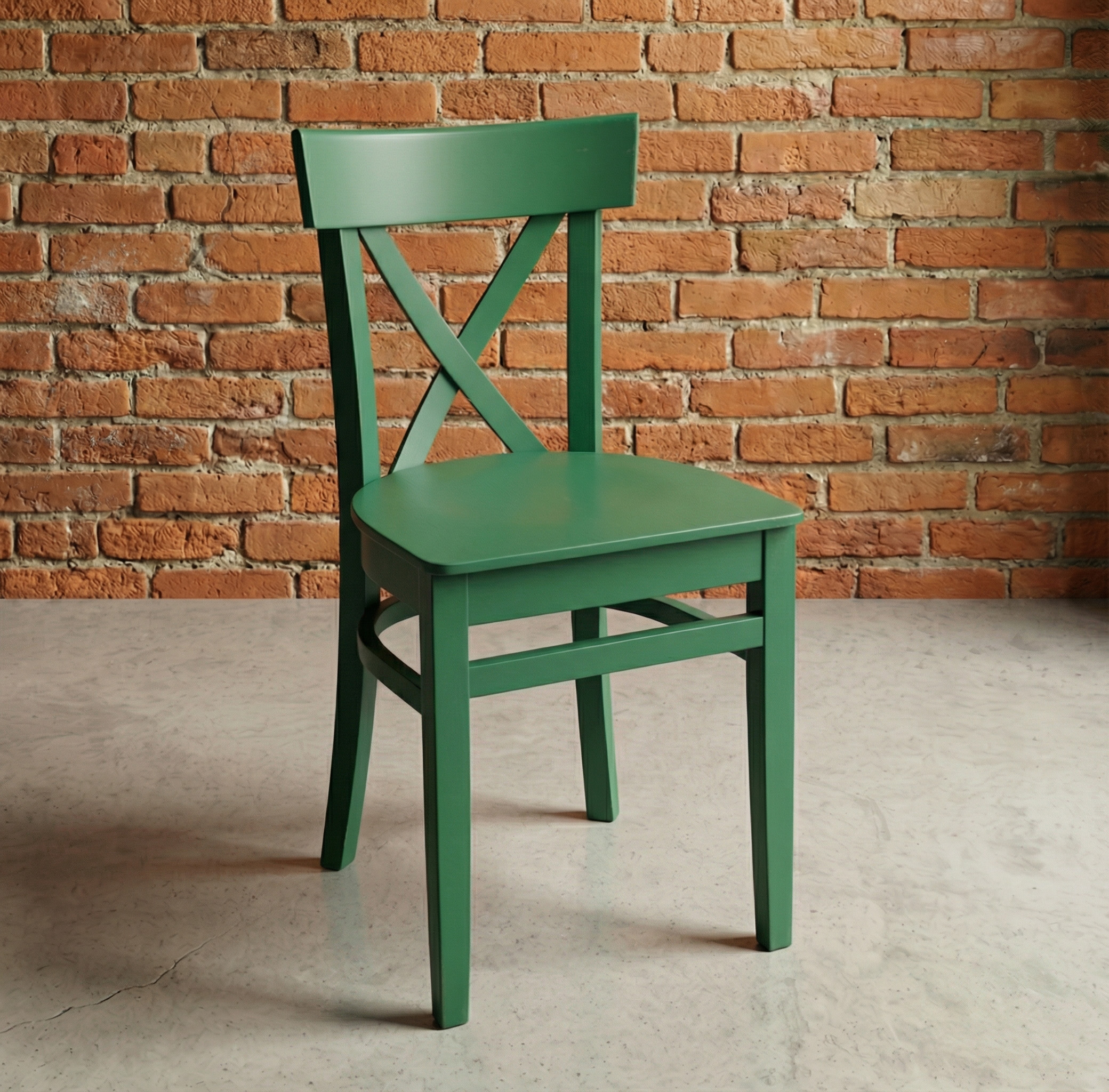 Scaun modern din lemn de fag, cu spătar în formă de „X”.