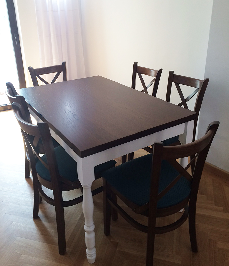 Masa este realizată din lemn de fag, în stil colonial, cu elemente strunjite, blatul este din MDF, iar la cerere se poate executa și cu blat din lemn masiv. Dimensiuni: L x l x H mm: 1200x800x760 mm. Scaunele pot fi tapițate la cerere. Dimensiuni scaun: L x l x h șezut/ H total mm. 420x530x460/860 mm.