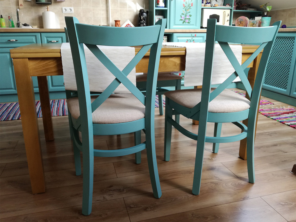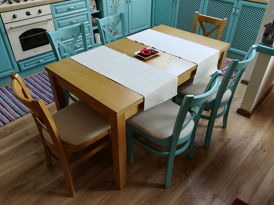 Dimensiuni masă Roxana: L x l x h mm: 1900x800x760 mm, din care extensie 500x800 mm. În imaginea de prezentare masa și cele două scaune au culoarea lemnului american oak, iar celelalte patru scaune sunt vopsite cu vopsea avand codul RAL 6034. Se pot alege și alte configurații (alte finisaje, alt număr de scaune, alte dimensiuni ale mesei).