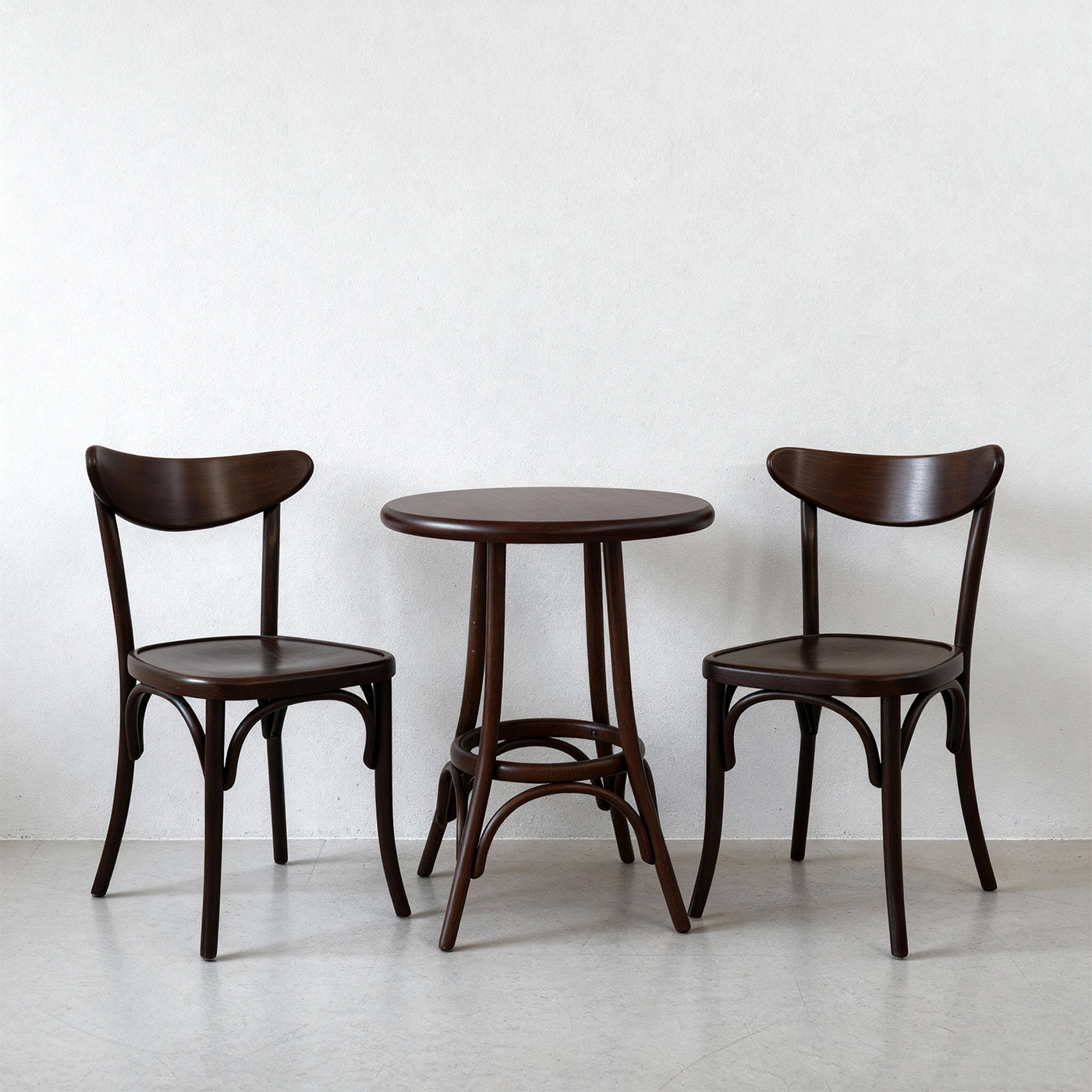 Set bistro format din masă Vienna (lemn de fag curbat, blat rotund din MDF furniruit) și 2 scaune Banana din lemn de fag curbat. Finisaj poliuretanic durabil; culori la alegere (nuc, mahon, wenghe).